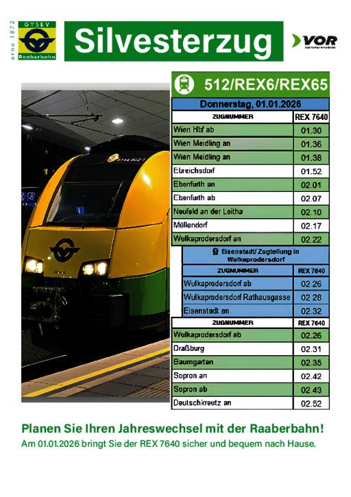 Silvesterzug der Raaberbahn – sicher und bequem ins neue Jahr Zum Jahreswechsel bieten wir wieder einen Silvesterzug an. Der REX 7640 bringt Fahrgäste in der Nacht auf 01.01.2026 sicher und bequem von Wien… Weiterlesen