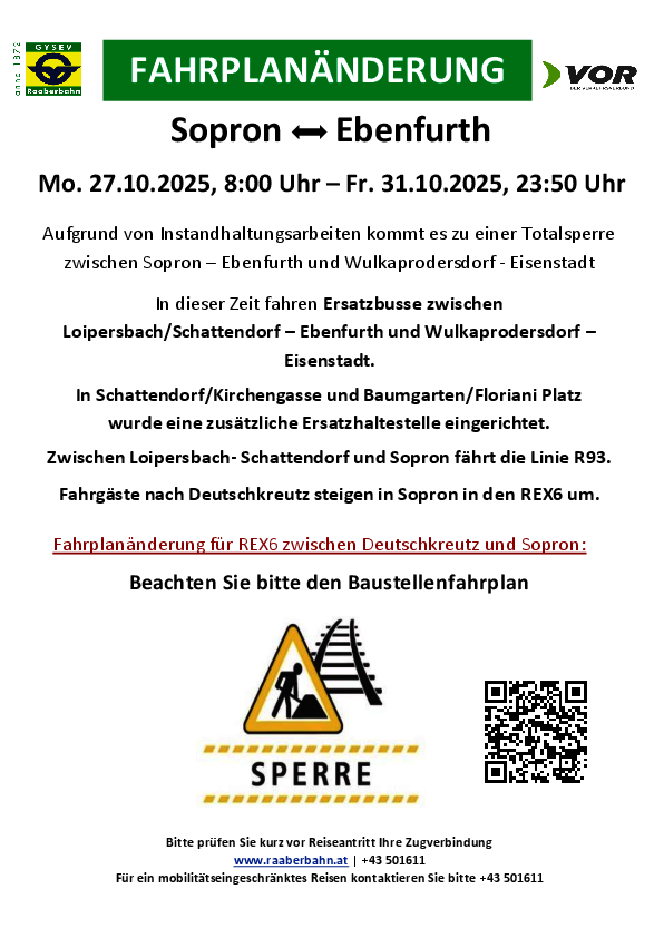 Aufgrund von Instandhaltungsarbeiten kommt es von Montag, 27.10.2025, 8 Uhr bis Freitag, 31.10.2025, 23:50 Uhr zu einer Totalsperre zwischen Sopron – Ebenfurth und Wulkaprodersdorf - Eisenstadt