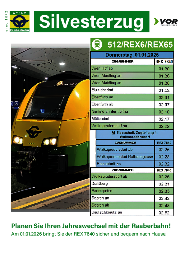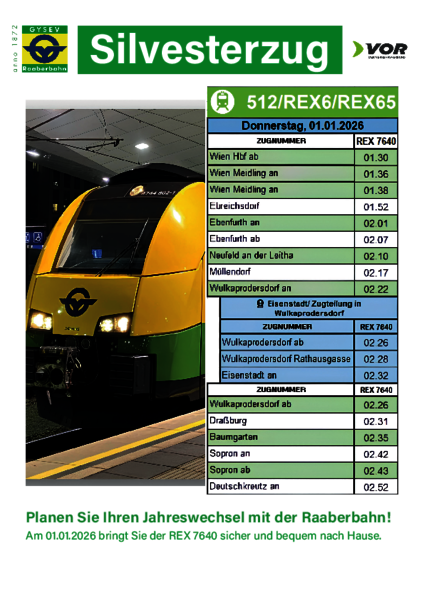 Zum Jahreswechsel bieten wir wieder einen Silvesterzug an. Der REX 7640 bringt Fahrgäste in der Nacht auf 01.01.2026 sicher und bequem von Wien Hauptbahnhof in Richtung Burgenland sowie mit Anschlussmöglichkeiten nach Eisenstadt und Sopron.